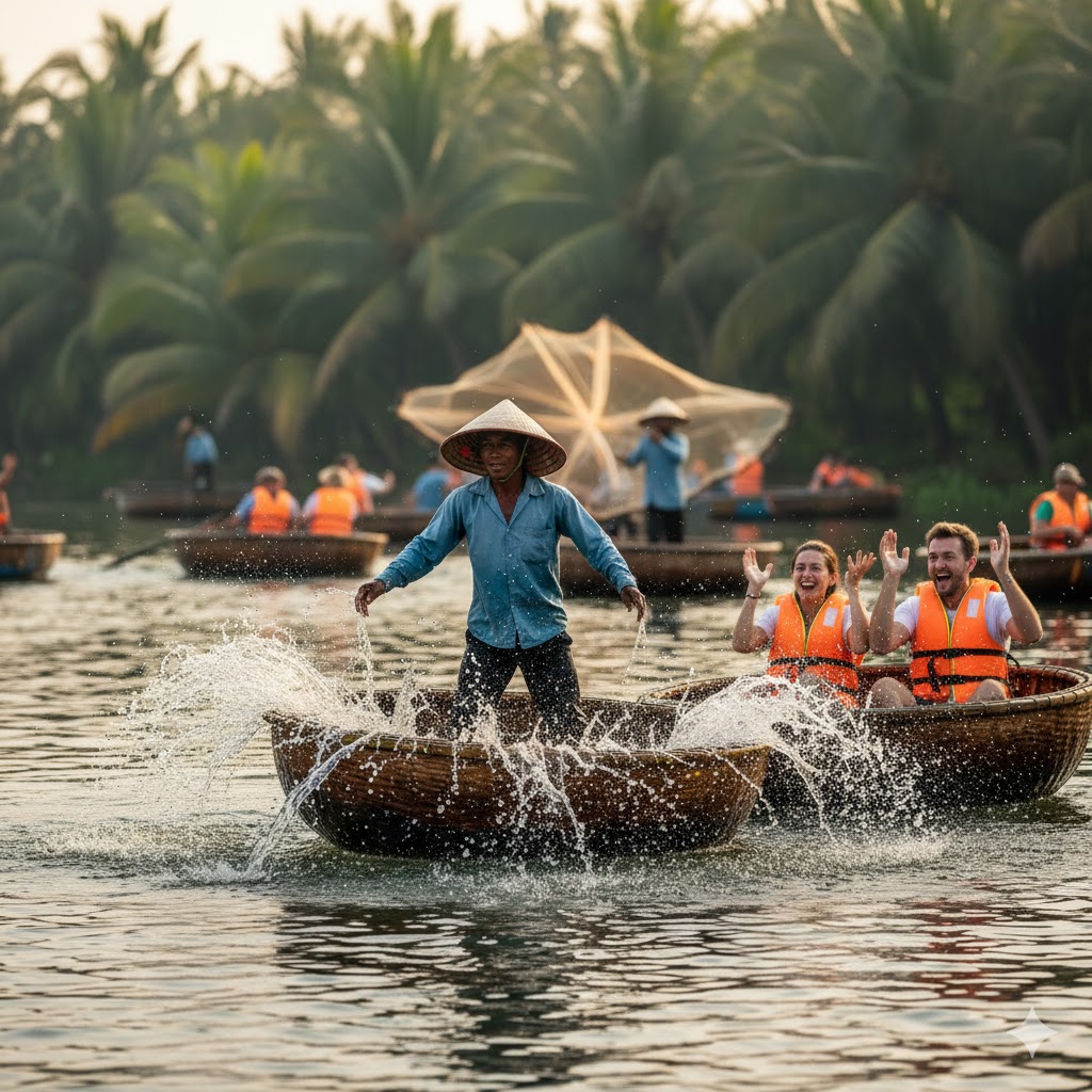 Fun Activities in Hoi An offer travelers unforgettable experiences, especially the traditional basket boat tours in Cam Thanh Commune, Hoi An City, Quang Nam Province. These exciting entertainment activities combine cultural immersion with thrilling water-based adventures that showcase the authentic beauty of Vietnam’s coastal waterways. Whether you’re seeking adrenaline-pumping moments or peaceful connections with nature, the basket boat tours at Dung Coconut Boat Tour provide a perfect blend of excitement and cultural discovery.